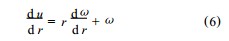 內外筒之間的流體因黏性作用在內筒帶動下層旋轉 ,各流層質點的角速度不同. 設距旋轉軸 r處 ,流體質點的角速度為ω( r) ,線速度 u = rω,則